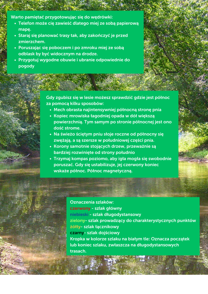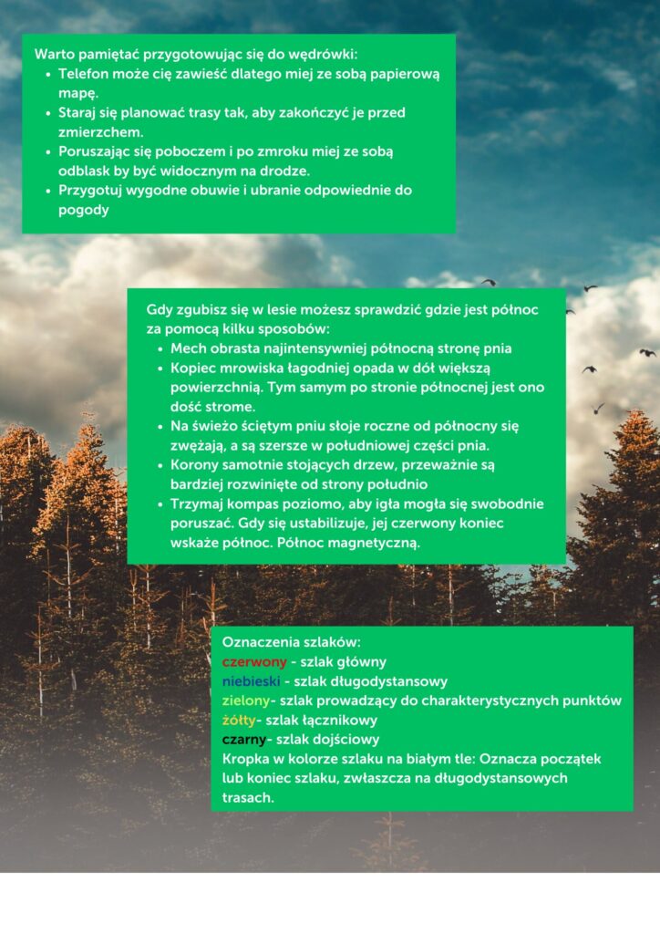 Chcemy, żeby nasze wędrówki nie były zwykłym spacerem. Chcemy, żeby uczestnicy spacerów poznali jak bezpiecznie poruszać się po lesie, jak czytać mapę i orientować się w terenie. Trasa wędrówki prowadzona będzie bezpiecznymi leśnymi drogami, często znakowanymi szlakami turystycznymi bądź ścieżkami dydaktycznymi
