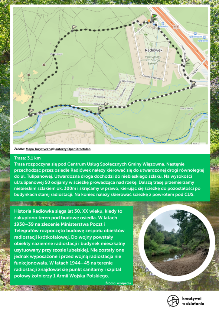 w ramach spaceru wybraliśmy się nad rzekę Świder w okolicach osiedla Radiówek. Rzeka znana jest bardziej ze spływów kajakowych, a my staraliśmy podczas wędrówki odkryć jej brzeg, który skrywa mnóstwo ciekawostek krajoznawczych! Dzięki działaniom z kompasem i mapą, uczestnicy mogli nabyć nowe umiejętności.