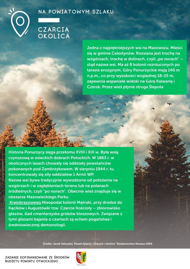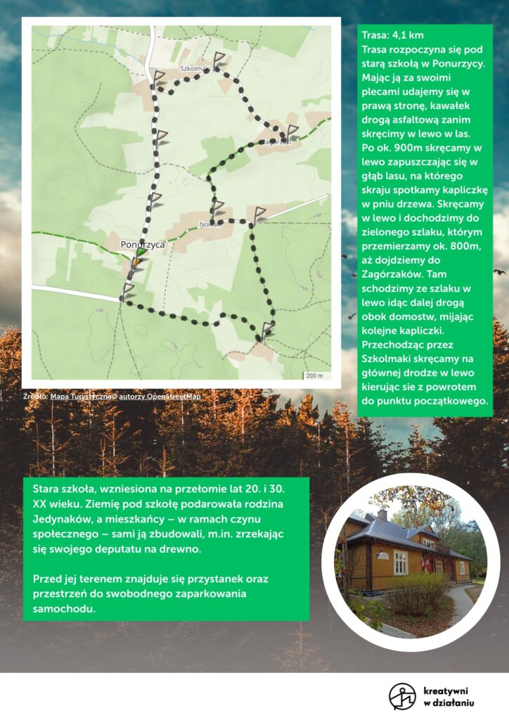 Trasa sobotniego spaceru prowadziła po jednej z najbardziej urokliwych miejscowości Mazowsza – Ponurzycy. Była to okazja do poznania historii i ciekawostek np. o tym skąd pochodzą okoliczne nazwy. Dowiedzieliśmy się skąd wzięła się mowa o czartach oraz jak poruszać się bezpiecznie w lesie z wykorzystaniem mapy. Trasa prowadziła po lokalnych drogach przechodząc przez zielony szlak.