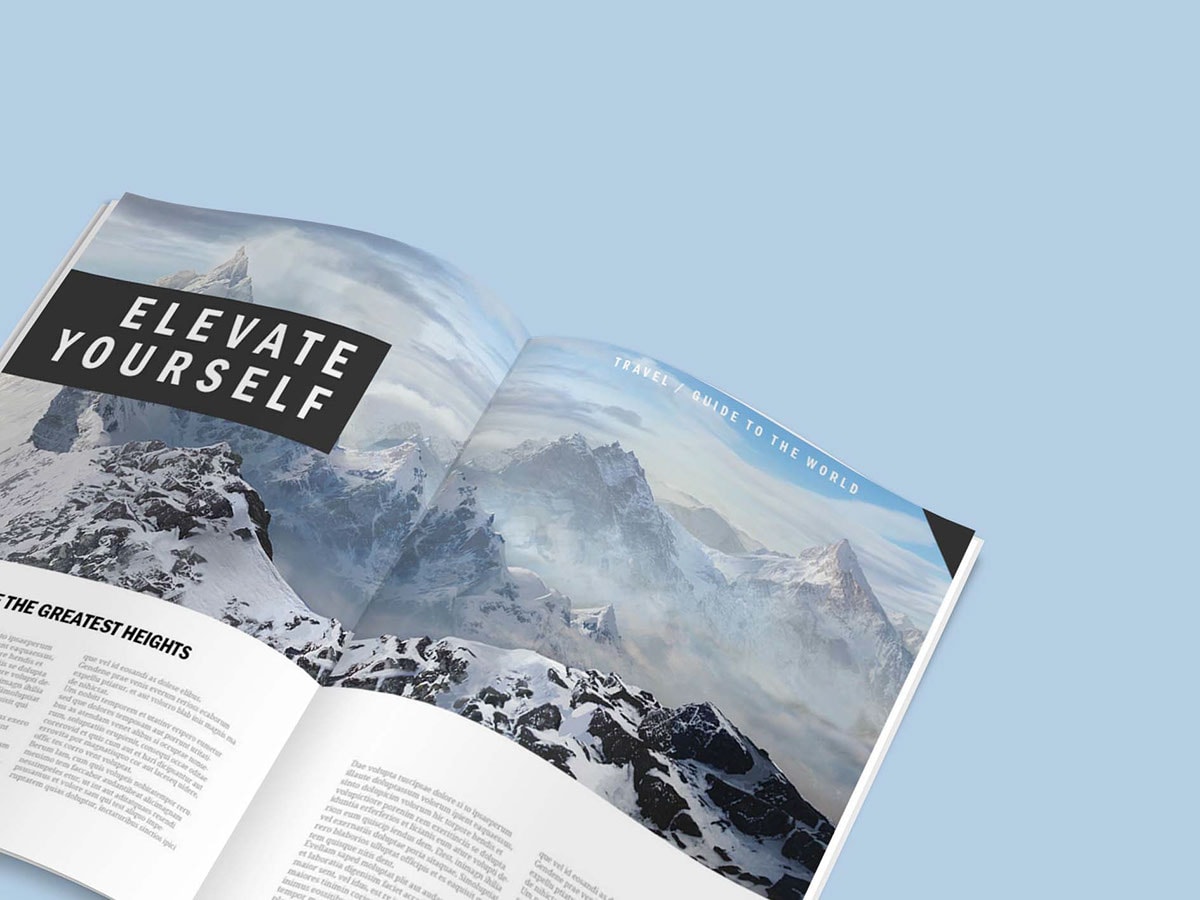 SHOWCASE YOUR MAGAZINE SPREADS IN A VERY REALISTIC MANNER WITH THIS FULLY EDITABLE PSD TEMPLATE. JUST DRAG AND DROP YOUR DESIGN INSIDE THE PSB FILE AND THE SMART OBJECTS WILL FINISH THE JOB FOR YOU.
